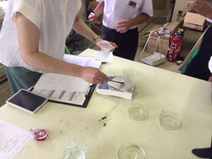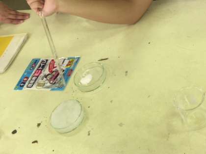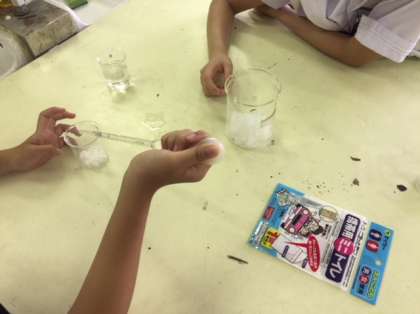 科学部が理科室で活動しています。携帯用ミニトイレに入っている高分子吸水剤を0.5g取り出して少しずつ水を加えていきます。凄い吸水力ですね〜。あっという間に膨らんできました。