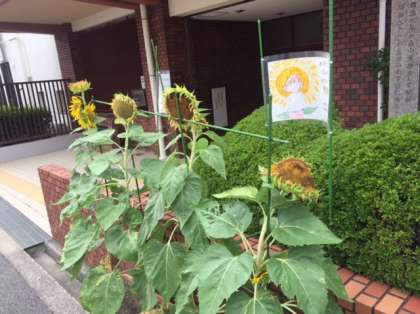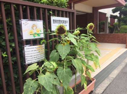 「はるかのひまわり」は今日で99日目を迎えます。種をまいてから明日でちょうど100日になります。黄色い花の部分が枯れてきて真ん中の茶色の種になるところが大きく見えます。