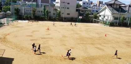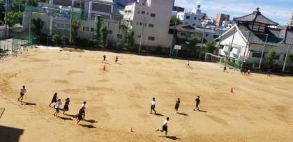 陸上競技部が、この暑い中、グラウンドを走っています。長距離を走っている生徒も、短距離を走っている生徒もいます。目標タイムにむかってがんばれ!