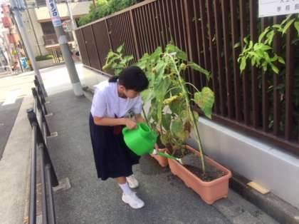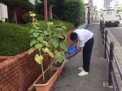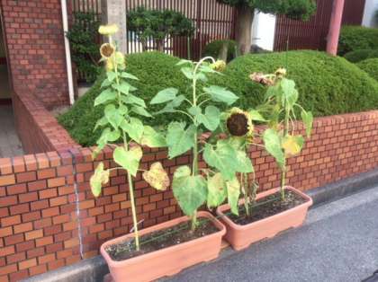 どの花も頭を垂れて、あとは種が取れるまでしばらくグラウンドの隅に置くことになりました。正門の前で見られるのは今日が最後です。