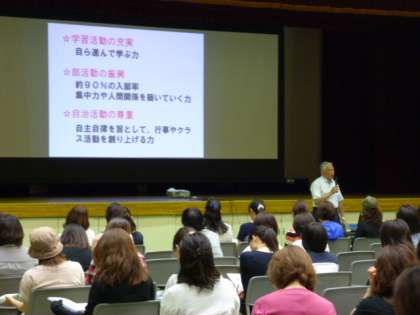 6月26日(木)13:30〜、天王寺区民センターにて、天王寺区3中学校PTA主催の公立高等学校説明会が開催されました。今年度は、6つの高等学校をお招きし、専門学科及び普通科の特色をそれぞれの高等学校から説明していただきました。200席用意をしていましたが満席になったため、急遽、席を増やすなど、多くの保護者の皆様に来ていただきました。