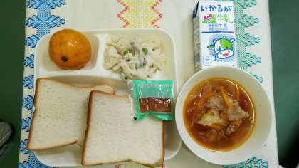 本日の献立は、豆乳マカロニグラタン(米粉)、トマトスープ、冷凍ミカン、食パン、ジャムです。