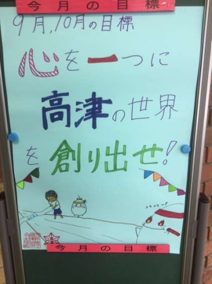 玄関ピロティに9・10月の学校目標が掲示されています。「心を一つに高津の世界を創り出せ!」です。今年度の体育大会・文化祭の目標にもなっています。みんな心を一つにして頑張りましょう。
