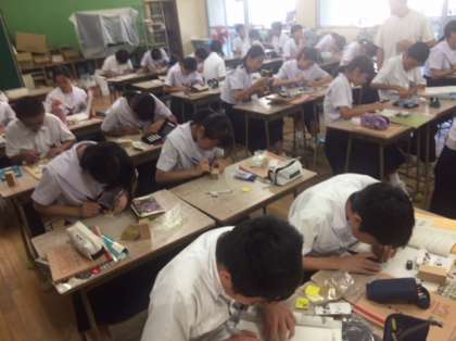 1年美術の授業の様子です。ハンコを作成しています。ハンコのデザインを考えて彫刻刀で彫っていきます。気をつけて作業しましょう。
