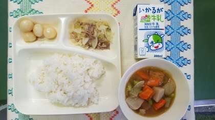 本日の献立は、鶏肉と里芋の煮もの、豚肉とキャベツの炒めもの、みたらし団子の月見行事献立です。