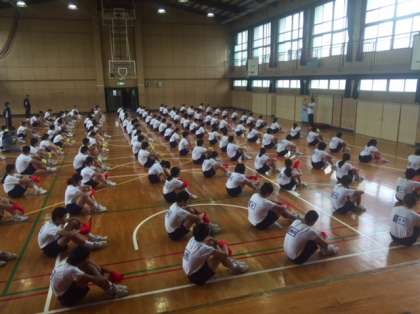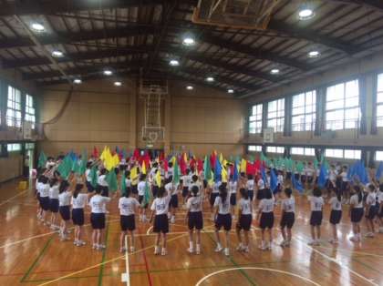 体育館で演技の最終チェックをしています。一人一人が全体の動きを確認しましょう。