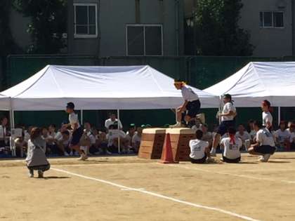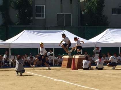2年男子のアスレチック走です。軽快に跳び箱を越えています。