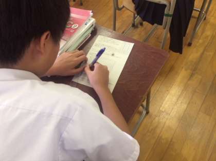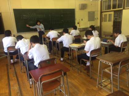 2年数学の授業の様子です。習熟度別少人数授業を行っています。一次関数のグラフを使って問題を解いていきます。少人数なので質問もしやすいですね。