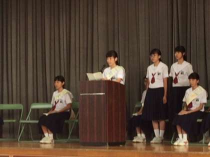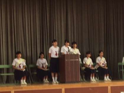 続いて副会長候補の演説です。「朝のあいさつ運動や女子のヘアピン等わ中心にこの高津中学校をよりよくしていきたいです。」応援演説は2人です。