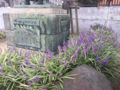 東校舎の横に「野口少年師弟像」がありますが、その台座の周りにある紫色の花が満開になっています。「ノシメラン」というユリ科ヤブラン属の花です。この花の花言葉は「忍耐」だそうです。銅像の台座には「忍耐は辛し されど其の実は甘し」と刻まれていますので、まさにピッタリの花が植えられています。