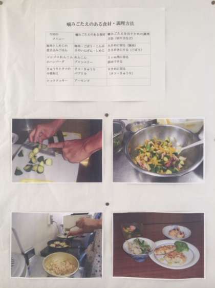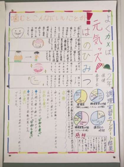 保健委員会のメンバーが、この夏に天王寺区保健センターで行われた調理実習に参加した時のことを模造紙にまとめています。保健室の前に掲示されています。噛みごたえのある材料を使った料理のようです。