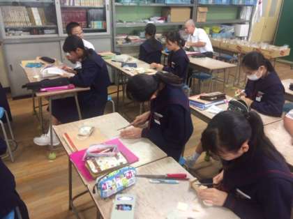 1年美術の授業の様子です。木の柄がついたゴム印を作製しています。自分で考えたデザインを彫刻刀で彫っていきます。どんな印鑑ができるかな。