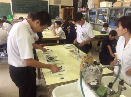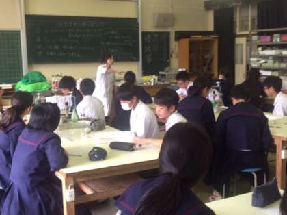 2年理科の授業の様子です。温度が変化する化学変化の実験です。封筒に鉄粉に活性炭を入れ、さらに塩化ナトリウム水溶液をしみこました半紙を入れてよく振りました。温度が上がりました。次にポリエチレンの袋に炭酸水素ナトリウムとクエン酸を混ぜ、よく振りました。温度が下がりました。簡易冷却パックですね〜。