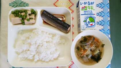 本日の献立は、さんまのさんしょう焼き、すまし汁、高野豆腐の煮物です。今の時期のさんまは、おいしかったですね。きれいに骨が残っていました。けれど、骨もやわらかくなっていたので食べた人もたくさんいたようですね。