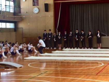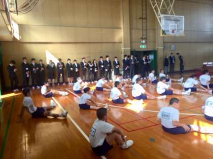 まず、会議室で挨拶を終えて、本校の概要説明を行いました。その後、校舎見学・説明を行い、2時間目の体育の授業を見学しました。