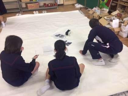 3年生は創作劇の発表に向けて係に分かれての作業が続いています。衣装係と背景係の様子です。