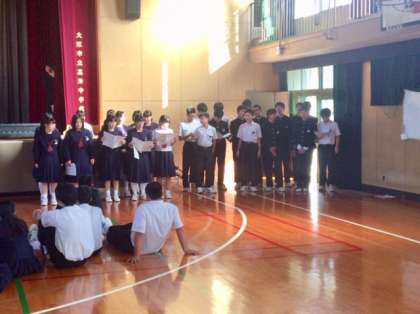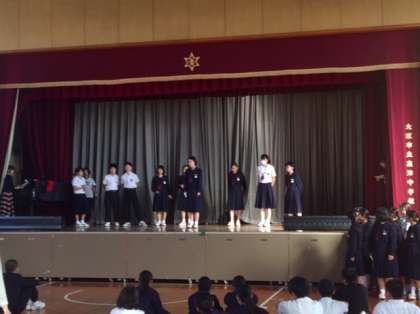 体育館の舞台では出演者が練習しています。しっかりセリフを覚えて演技に集中してくださいね〜
