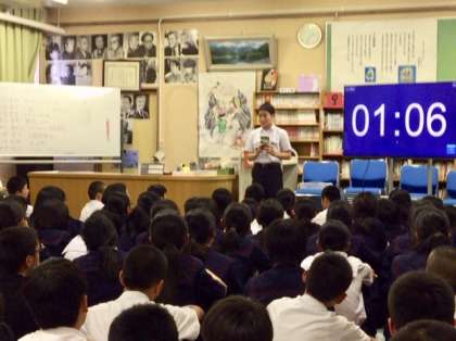 最後のバトラーは1組の代表です。唯一の男子です。紹介する本は「ペンギンハイウェイ」です。好きになれなかった読書がこの本によって好きになったかもということです。皆さんも是非読んでください。以上で8名のバトラーの発表が終了しました。全員による投票の結果、第2学年チャンプ本は7番目に発表した4組代表の「乱反射」に決定しました。おめでとうございます。文化祭で学年代表として発表します。皆さん良く頑張りました。