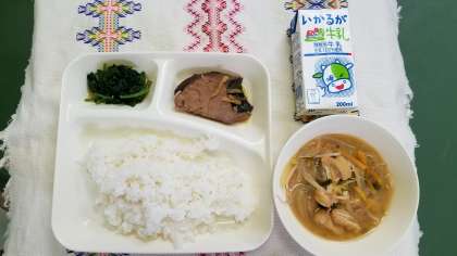 本日の献立は、なまりぶしの生姜煮、みそ汁、ほうれん草のごまあえです。