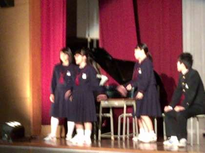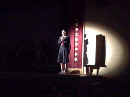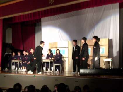 いよいよ3年生の劇です。題名は「ORIZURU」です。大阪市立清堀中学校を舞台に展開される「本当の平和とは」をテーマにした創作劇です。