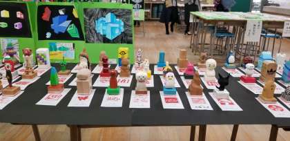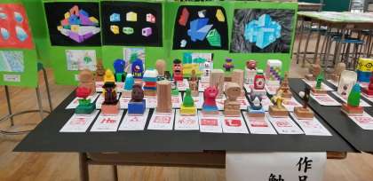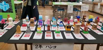 美術室の展示作品です。2年生のハンコの作品です。印章はもちろん、持ち手の形にこだわりがありますね。