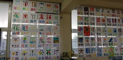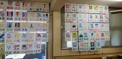 美術室の展示作品です。1年生の作品です。漢字が楽しい絵文字になってます。
