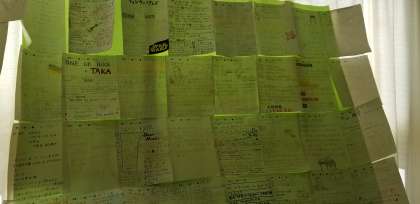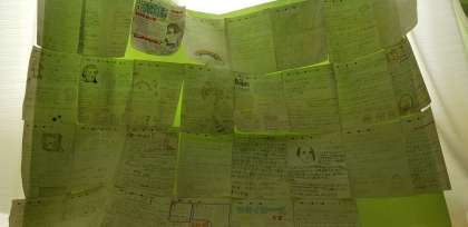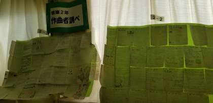 被服室の展示作品です。2年生音楽の作曲者調べ作品です。最近の歌からクラッシックまで作曲家が書かれています。
