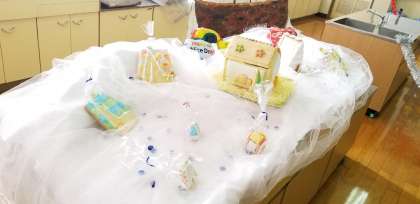 調理室の展示作品です。家庭科部の作品です。お菓子の家を作りました。幼稚園児からたべれるの?質問がありました。