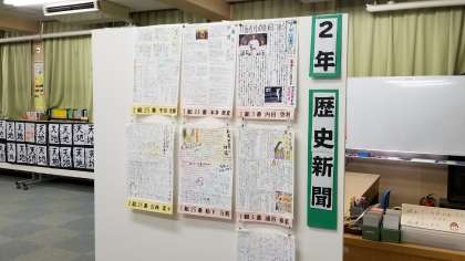 図書室の展示作品です。2年生の歴史新聞です。内容はもちろん、新聞のレイアウトもしっかりとしていますね。
