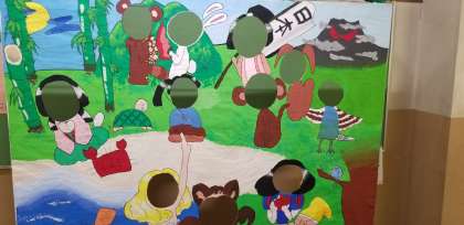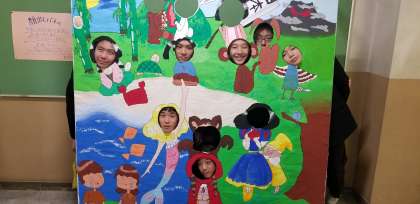 美術室前の展示作品です。美術部の顔出しパネル作品です。世界の童話の登場人物を集めファンタジーのかわいい世界を表現した作品です。