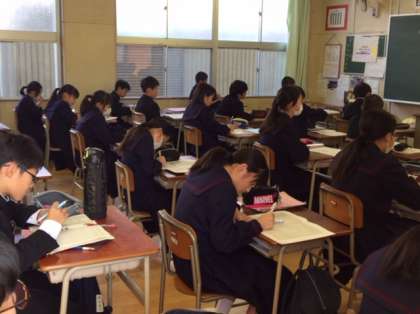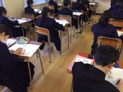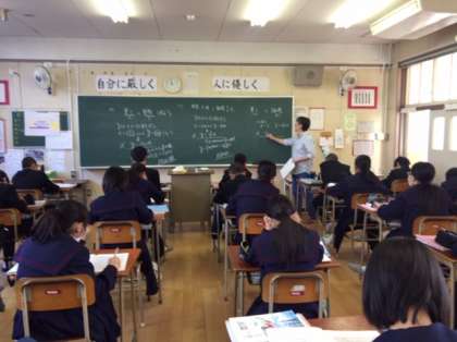 1年数学の授業の様子です。比例と反比例の利用です。プリントに出された問題の中の数字をどう活用しながら解くかを学習しています。