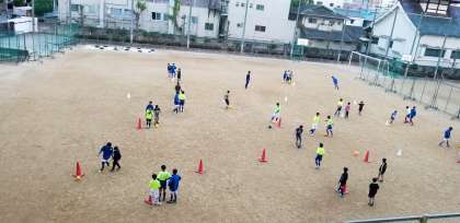 サッカーは、はじめは、ボールを手で持って、次にボールを足で扱う練習をしました。