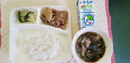 本日の献立は、豚肉のコチジャンいため、もずくスープ、ブロッカコリーのナムル風あえものです。これは、平成29年度の学校給食献立コンクール最優秀賞をもとにした献立です。