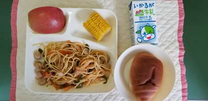 本日の献立は、チキントマトスパゲッティ、焼きとうもろこし、りんごです。