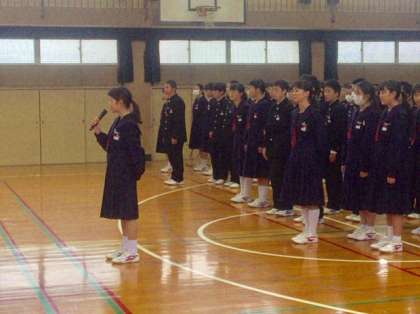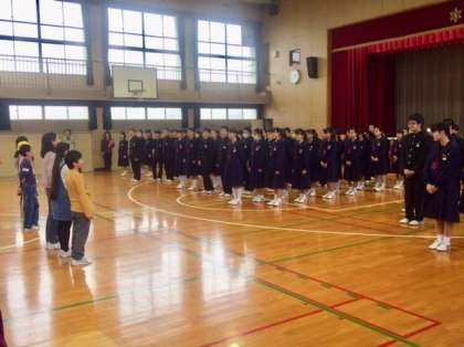 本日6時間目、体育館において小中連携の取り組みとして「英語でインタビュー」を行いました。生徒の司会進行で進められています。まず、小学校・中学校それぞれの代表があいさつをしました。