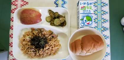 本日の献立は、オイスターソース焼きそば、きゅうりの中華あえ、りんご、パン、牛乳です。