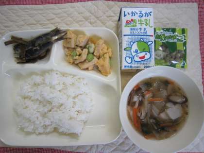 本日の献立は、いわしのしょうが焼き、うすくず汁、高野豆腐の卵とじ、まっ茶大豆、ご飯、牛乳です。