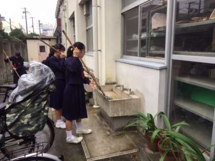 掃き掃除が終わった廊下はさらにキレイになるよう、モップがけも行います。みんなで協力してキレイになるといいですね〜。