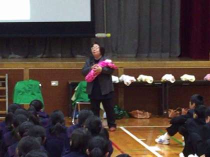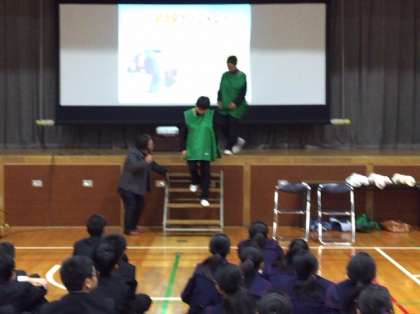 続いて、男子2名が妊婦体験をしました。大きなお腹の妊婦仕様の装備を着て、階段を下りたり、床の物を拾ったりして妊婦の大変さを体験しました。