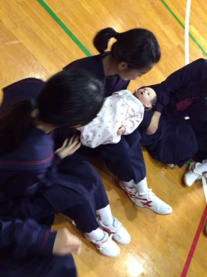 その後、各クラスに分かれて、赤ちゃん人形体験をしました。重さも実際の赤ちゃんと同じ人形です。照れながらも代わる代わる抱っこしました。