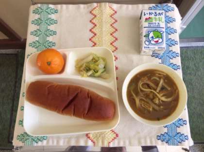 本日の献立は、カレーうどん、白菜のおひたし、パン、みかんです。具だくさんのカレーうどんでした。パンも人気の黒糖コッペパンです。美味しかったですね。今年のパンの給食は今日で終わりです。朝、パン屋さんがお礼を言いに来ました。今日も感謝の気持ちを込めて、ごちそうさまでした。