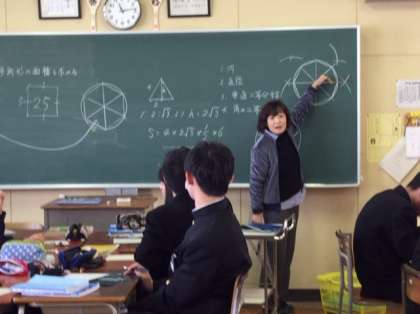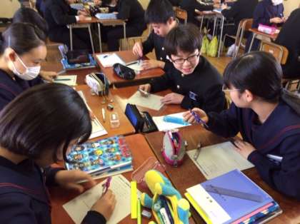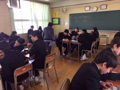 3時間目、3年数学科において相互参観授業を行いました。三平方の定理の利用ということで、正八角形を作図し、面積を求めていきます。どのような見方、考え方をすればいいのかグループで知恵を出し合いました。