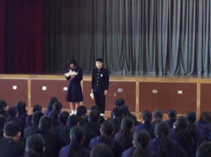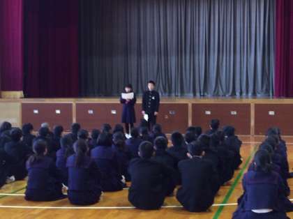 2時間目、2年学年集会を行いました。各クラスの委員長から2学期の振り返りとまとめの話がありました。写真は上から1組、2組です。
