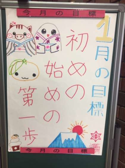 本日より、1月の学校目標が玄関ピロティに掲示されています。「初めの始めの第一歩」です。初めの一歩をしっかりとスタートしようということで決まりました。2019年のスタートにふさわしい目標ですね〜。