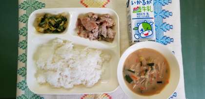 本日の献立は、豚肉のこまだれ焼き、みそ汁、きくなと白菜のおひたし、米飯、牛乳です。