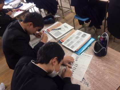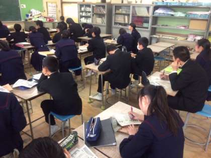 1年美術の授業の様子です。「色紙を飾る額を木彫の柄で埋めよう」ということで、彫刻刀の種類や彫り方の名称を学習したあと、額のデザインに入りました。どんな額が出来るか、楽しみですね。