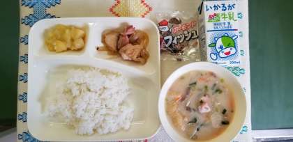 本日の献立は、鶏肉の甘辛焼き、かす汁、栗きんとん、アーモンドフィッシュ、ごはん、牛乳です。おいしかったですね。