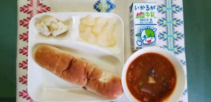 本日の献立は、ビーフシチュー、カリフラワーのピクルス、和なし、おさつパン、牛乳です。