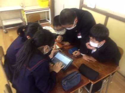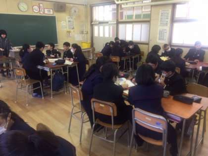 グループに分かれての調べ学習です。来校する留学生の母国について調べています。2組の様子です。