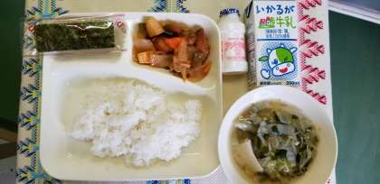 本日の献立は、酢豚、ワンタンの皮のスープ、焼きのり、発酵乳、ごはん、牛乳です。